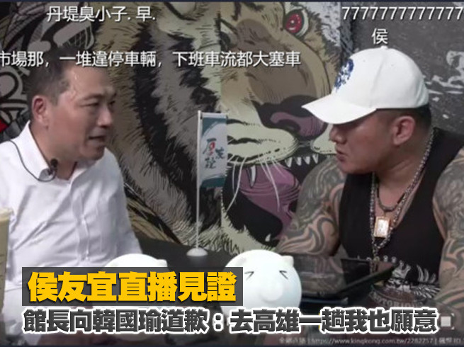 對此,館長晚間八點與侯友宜合體直播時表示,這一切都是誤會,希望韓國瑜能接受他的道歉,「去高雄一趟我也願意去」,日後他會謹嚴慎行。