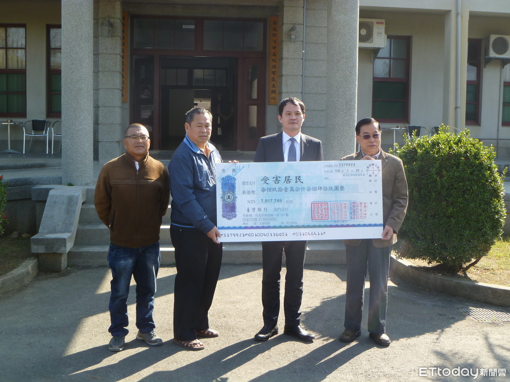 ▲環保局林淵淙局長代表市府見證中石化公司代表林青董事長特別助理,將11人之支票轉交里長代發。(圖/記者林悅翻攝)