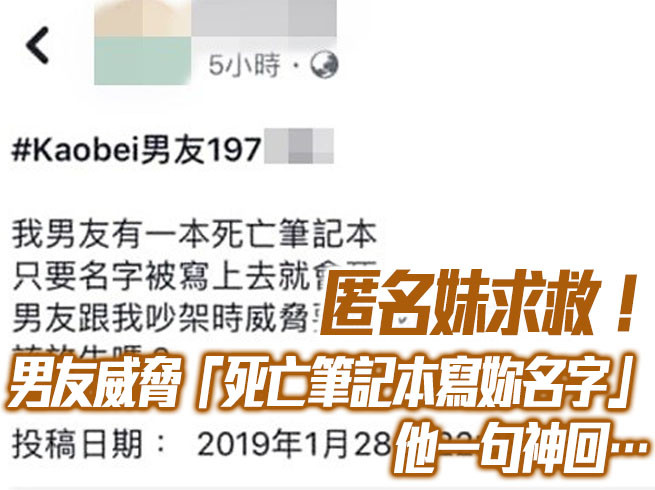 許多情侶吵架時,有可能會口不擇言,甚至講出很奇葩的話,讓旁人聽了超傻眼。一位女友就貼文靠北男友,說男方稱自己有一本「死亡筆記本」,每次吵架的時候都威脅「要把妳的名字寫上去」,忍不住問網友「該放生嗎?」貼文被截圖轉貼,其他人紛紛看傻「放生然後找柯南當男朋友」、「笑到一個嘿菇」。