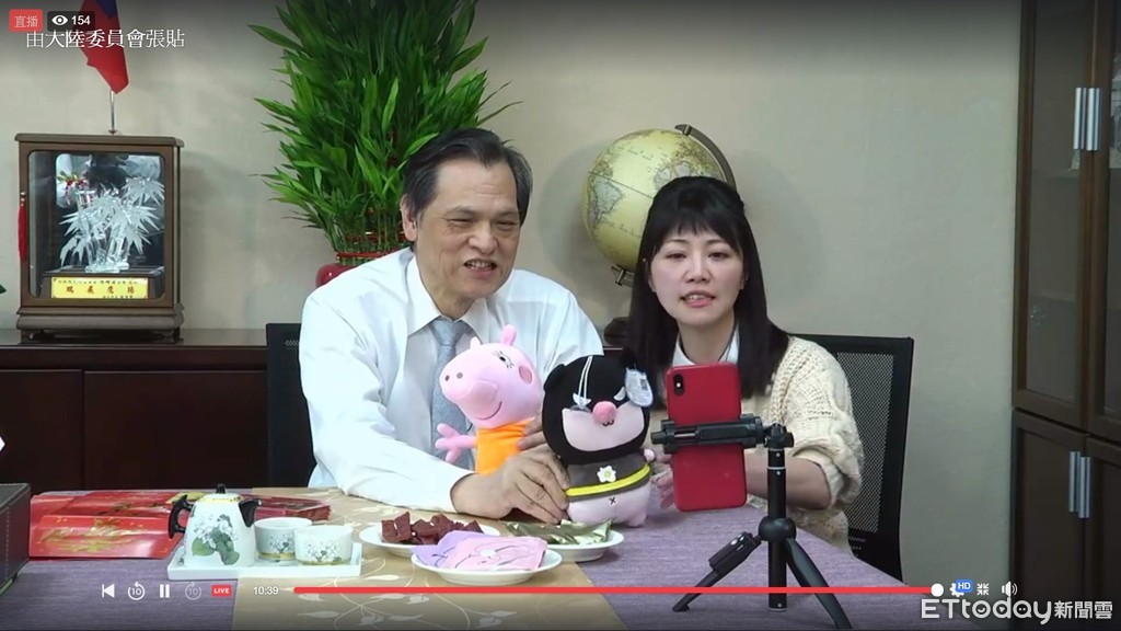 「港湖女神」台北市議員高嘉瑜今天下午三點和陸委會主委陳明通直播,開頭高嘉瑜先推銷自己的春節春聯,陳明通則表示,「聽說直播一定要有一個動物」,拿出佩佩豬和台灣黑豬玩偶,宣傳防疫非洲豬瘟的嚴重性。