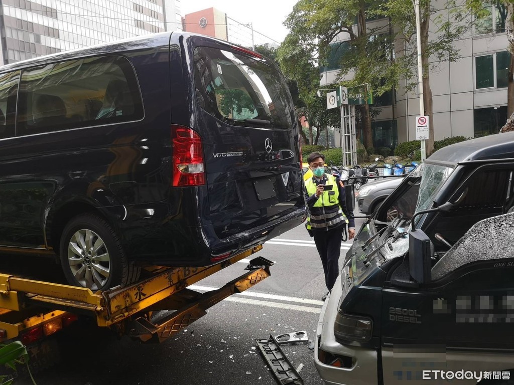 台北市建國北路民生東路口30發生車禍事故,其中一輛拖吊車上載著準備去交車的「賓士休旅車」遭後方廂型車撞上,造成賓士車屁股凹陷,所幸僅一名女子輕傷,至於詳細車禍原因還有待相關單位釐清。
