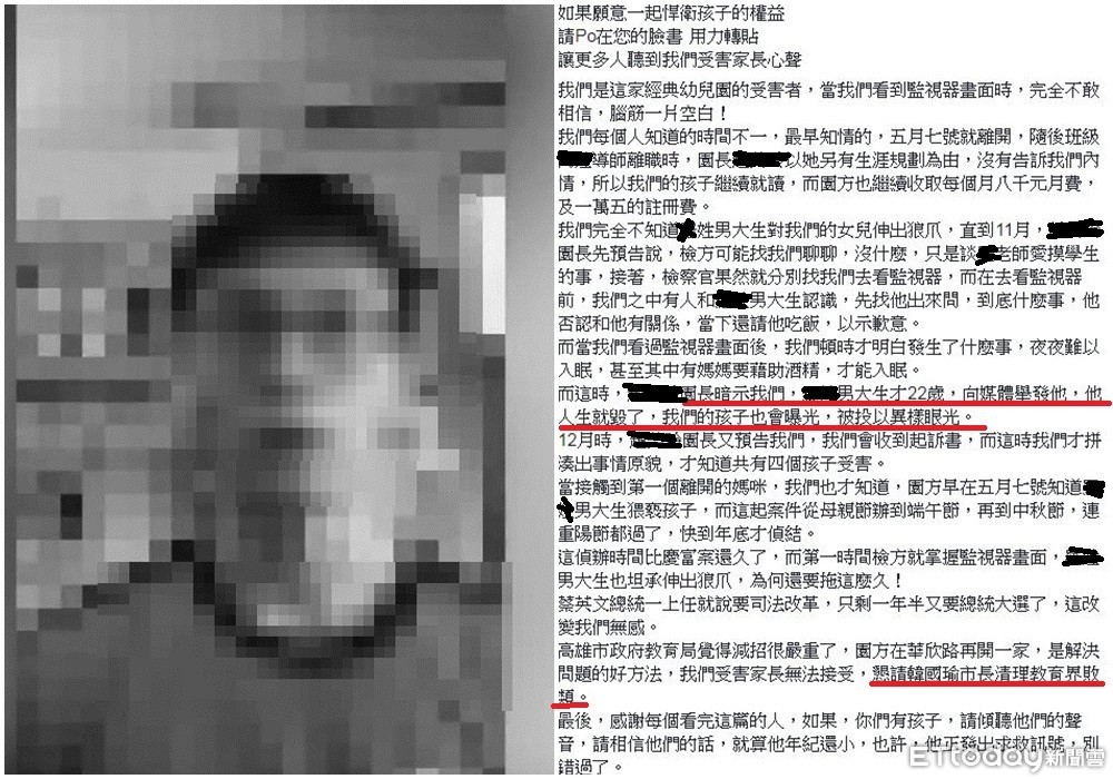 高雄某連鎖幼兒園發生英文老師(男大生,22歲)對園內4女童伸出狼爪,趁著午休時間蓋住棉被做出撫胸、磨蹭下體等惡行;檢方目前已經將這名老師依加重強制性交罪提起公訴。由於事發後幼兒園態度差,甚至將受害家長的個資透露給男大生家屬,讓許多民眾頗為不滿,30日更有家長匿名臉書爆料,直言「懇請高雄市長清理教育界敗類」。