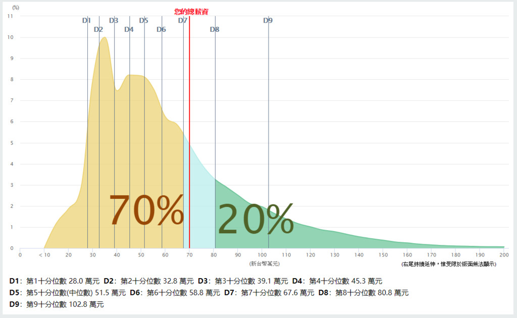 ▲35歲年薪70萬已經勝過70%的受雇者。(圖/翻攝自行政院主計處薪情平台)