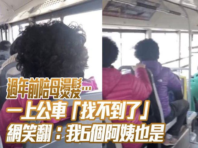 農曆年前許多人都想換個新髮型象徵新氣象,微博近日流傳一部有趣的影片,一名網友PO出陪媽媽去燙頭髮的過程,沒想到一坐上公車,竟然還有另外兩名婦人燙了同樣的髮型,身上也穿著類似的羽絨外套,光看背影根本無法分辨出來誰是誰,「一上車就找不到媽媽了。」
