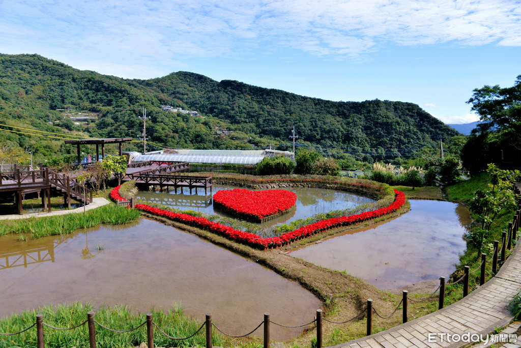 大地處介紹,白石湖地區的同心池因雙心輝映的造型與充滿幸福的氛圍而聞名,這次因應新春,同心池規劃以擁有幸福花語的聖誕紅,將內島及外圍心型進行彩妝,並搭配綠色的金露花穿插佈置,將富貴的形象完美呈現。