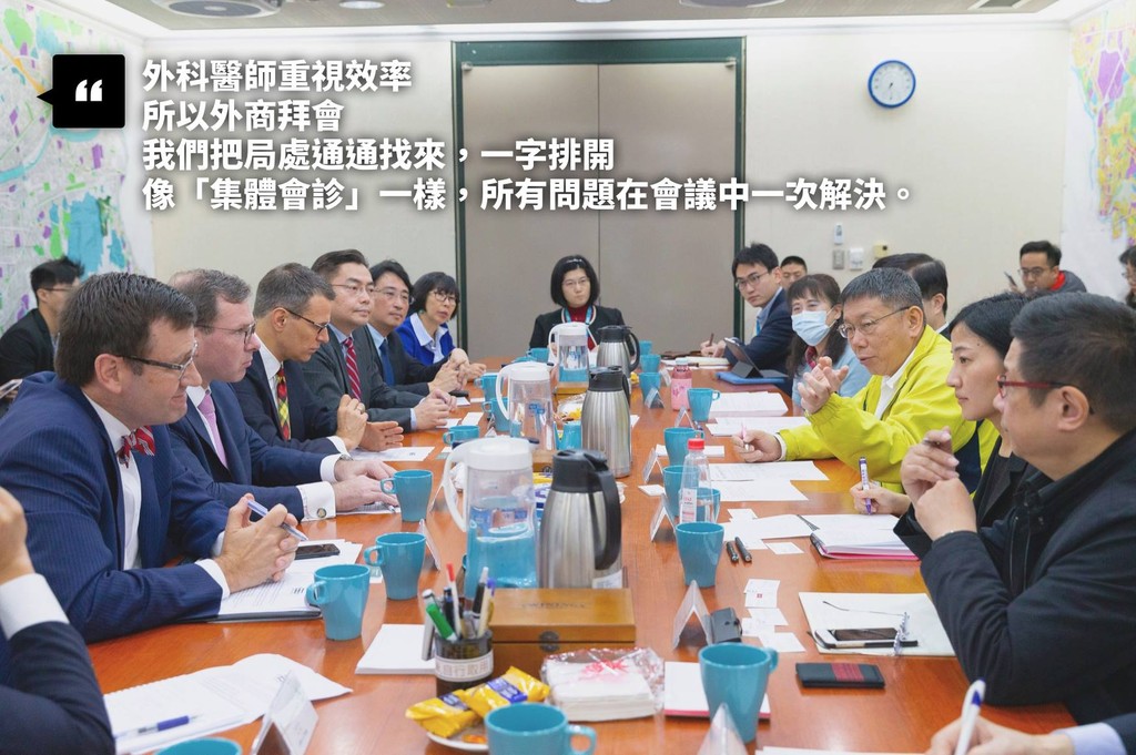 台北市長柯文哲在臉書中,PO出市府各局處與外商開會的照片,強調「外科醫師最重視效率」所有問題都要像集體會診一樣,一次解決。