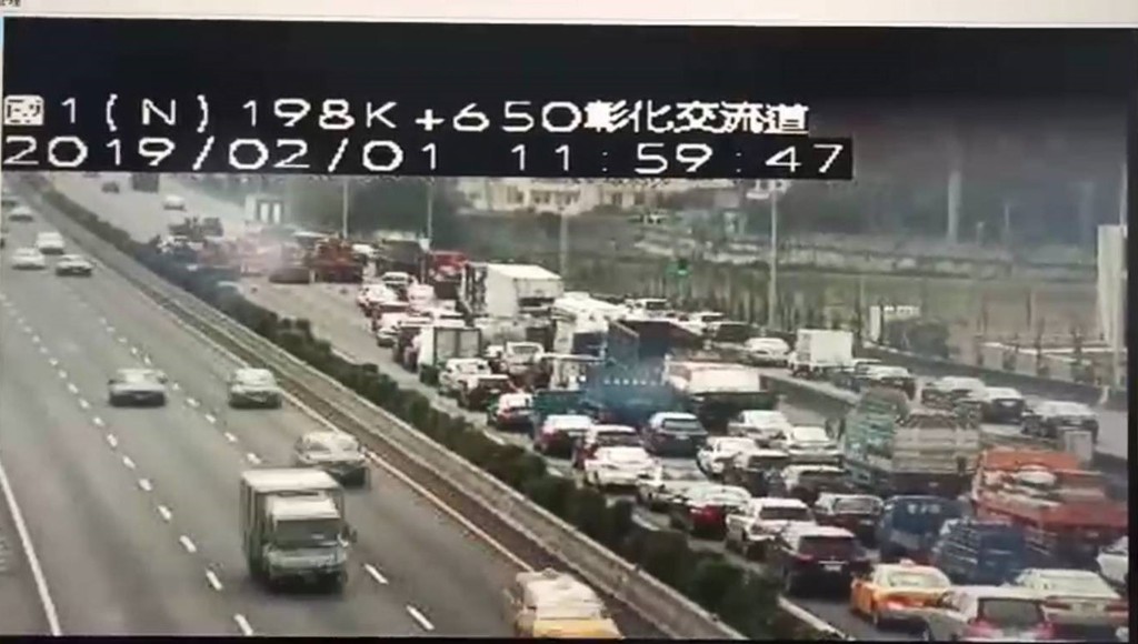 國道一號南下彰化交流道入口,發生在1日接近中午,30歲溫姓駕駛聯結車,未保持安全車距與4輛自小客車追撞事故,1名26歲黃姓女駕駛頭部及額頭撕裂傷,並無大礙,車陣一度圍堵5公里,國道三隊全線封閉,僅剩路肩可通行,肇禍原因仍待釐清調查。