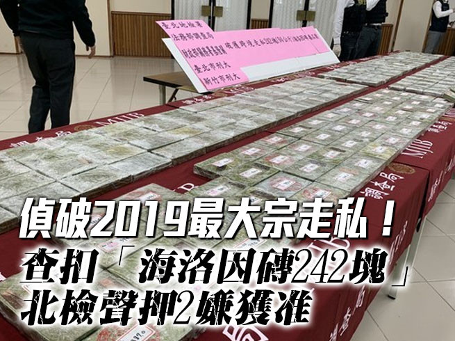 台北地檢署指揮調查局台北市調處等單位,偵辦跨國運毒集團,查獲2019年度最大宗海洛因走私案件,張姓和顏姓2人,涉從泰國金三角,走私包裝印著「一帆風順」、「福祿壽」宇樣的海洛因來台,被專案人員在基隆港扣得海洛因磚242塊,並已聲押2人獲准。