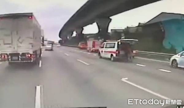 ▲國道1號北上43公里處,發生7車連環撞車禍, 邱姓老翁經消防人員緊急送氧及送醫。(圖/桃園消防局提供)