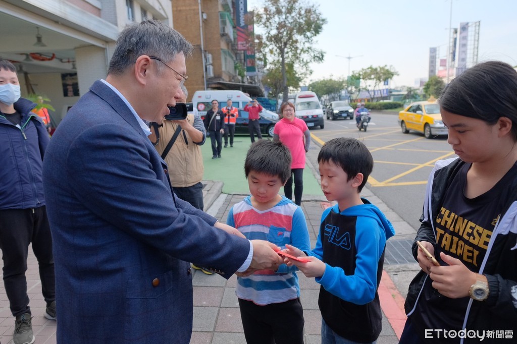 ▲柯文哲1月底到年貨大街拜年,又在2日前往發放紅包,見到路邊小朋友也發送紅包展現親民的一面。(圖/記者邱中岳翻攝,下同)