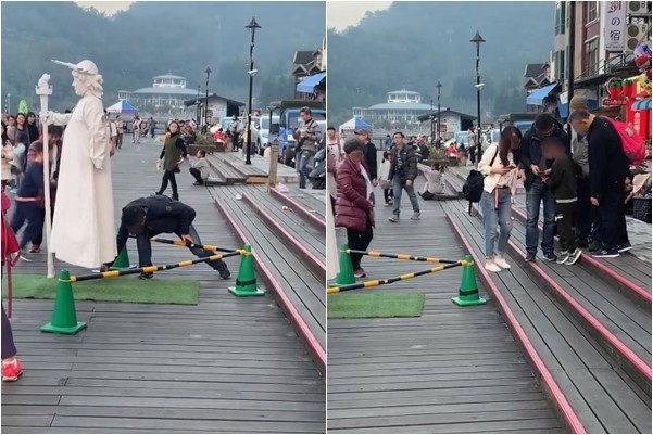 「可以尊重一下街頭藝人嗎?」一名網友在臉書分享一段影片,街頭藝人化作全身雪白的自由女神像,架著手杖凌空站在日月潭風景區,卻有一名男性遊客好奇,二度跨越圍欄彎腰想看看裙襬底下「凌空的秘密」,還拿出手機由下往上偷拍,隨後一臉滿足地在旁欣賞照片,還和年幼的男童分享,誇張行徑在網路上迅速延燒,引起網友猛力撻伐。