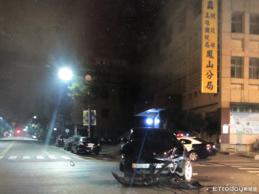 警方調查,52歲李姓男子今晨3時許駕駛保時捷macan經過鳳山曹公路、光復路口時,與31歲莊男駕駛的白色轎車發生碰撞,白車疑似過彎車速過快,撞斷路邊警示桿,造成車頭前半部嚴重毀損,車輪噴飛,零件散落,所幸駕駛安全氣囊爆開,僅受輕傷,保時捷車頭也全毀,駕駛受輕傷。