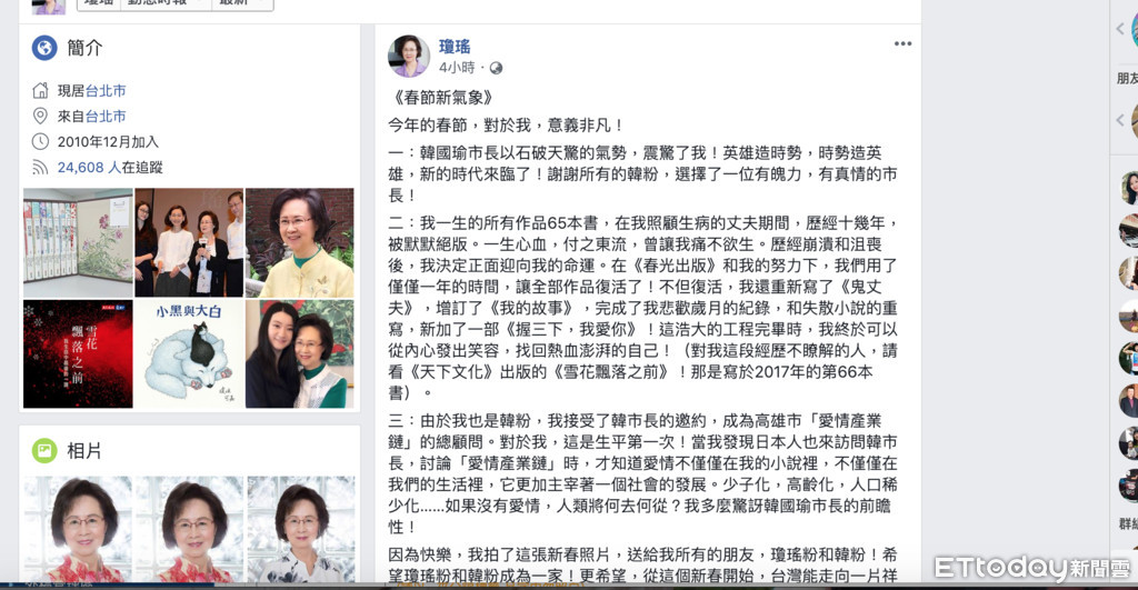 高雄市長韓國瑜聘請義務性質的愛情產業鍊總顧問瓊瑤在臉書發文,不但敘述今年的春節,對她來說有三個意義非凡的事,第一個是韓國瑜當選市長、第二件事就是自己用一年的時間將一生已經絕版的作品65本書全數復活了,還重寫了新作品,第三件事情就是擔任「愛情產業鍊」總顧問,對於日本人來前來高雄市跟韓國瑜討論「愛情產業鍊」,瓊瑤驚訝韓國瑜的前瞻性。