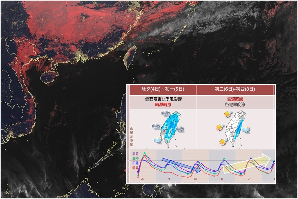 氣象局指出,春節連假天氣變化快速,主要有兩波東北季風的影響,第一波為4、5日除夕、初一期間,受鋒面及東北季風影響,天氣較為濕涼,除了北東會下雨,中南部也可能會有局部下雨的情況;第二波則是預計在假期尾聲9、10日初五、初六,北東將再度轉濕轉涼。