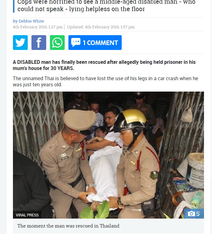 一名遊客日前在經過泰國東北部的一棟3層高別墅時,聽到屋內傳來奇怪的聲音後察覺有異,於是趕緊報警請人來查看。沒想到警察到場破門而入後,竟然發現一名雙腳無法行動的男子,確認過後發現該名男子在10幾歲時發生車禍,他的母親將他鎖在這間房子裡,每天來找他並將食物放在門外後離去,而他已經有整整30的時間沒有看到外面的世界,並對闖入屋內的陌生人感到害怕。