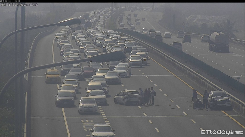 ▲國1北向360.5公里發生3輛小客車追撞事故佔用內線車道,造成後方車隊回堵5公里。(圖/高公局提供)