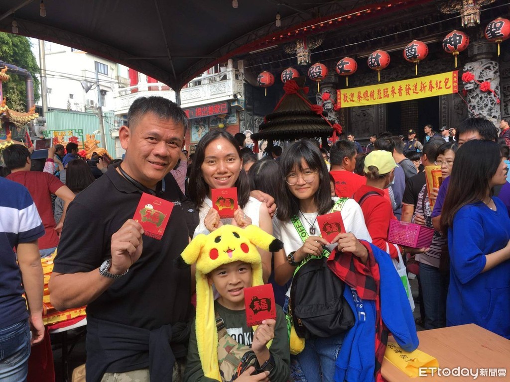 蔡英文總統6日下午1點35分抵達,一下車由廟方主委總幹事等人陪同入廟,由廟內禮生引領進行參拜上香、獻花、獻果後,轉往廟前廣場與現場來賓及廟方代表合照,緊接著發放民眾最期待的福袋。不少鄉親提前幾個小時到現場排隊守候,發放過程中有家住馬來西亞麻六甲鄭成翁帶著妻子及子女專程為了「小英紅包」特地透過台灣友人安排協助來到嘉義,對於能夠由蔡總統手中親手拿到紅包,鄭成翁全家人都感到很開心,他說在馬來西亞要親自去元首的家才能領到紅包,台灣的總統這樣下鄉相當親民。