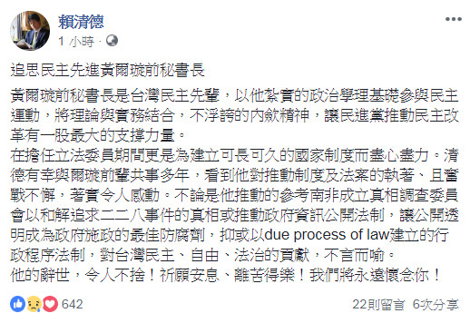 賴清德10日上午在臉書上提到,「黃爾璇前秘書長是台灣民主先輩,以他紮實的政治學理基礎參與民主運動,將理論與實務結合,不浮誇的內歛精神,讓民進黨推動民主改革有一股最大的支撐力量。在擔任立法委員期間更是為建立可長可久的國家制度而盡心盡力。」