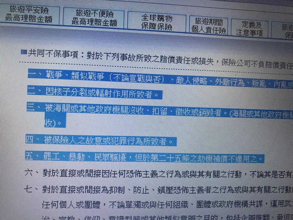 一家產險公司2月11日下午接到客人來電,詢問其刷卡銀行贈送的旅平險有沒有理賠罷工事件導致的班機延誤等項目?經產險公司查詢合作方案內容,確認「罷工事件」為信用卡綜合保險的不保事項,也只能向民眾說聲抱歉,無法提供保險金理賠申請協助。