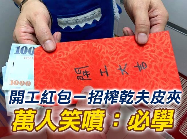 從悲慘人夫PO在臉書「爆廢公社」照片可見,紅包上有著大大粗體4黑字「開工大吉」,裡面則是塞著微有厚度的千元鈔,數一數竟有8張「小朋友」,這一份開工紅包超有誠意,但背後故事卻有點悲傷了。