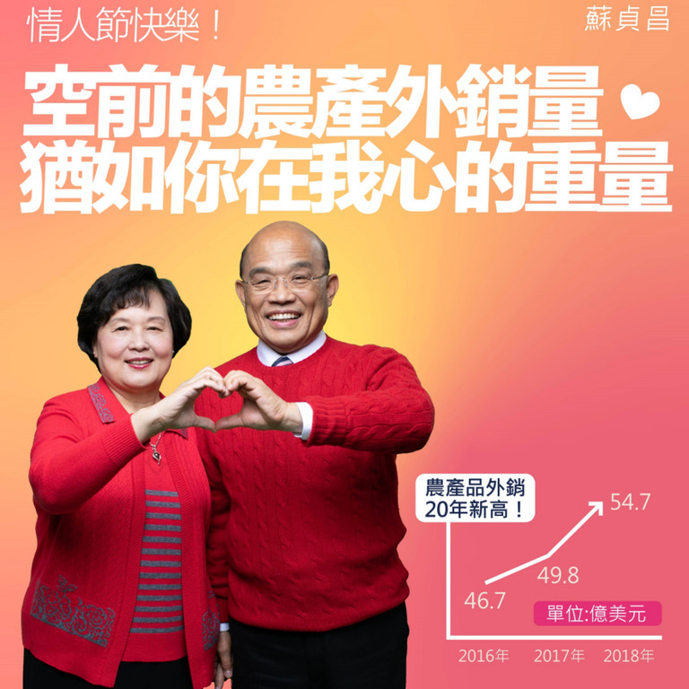 蘇貞昌上任行政院長後透過通訊軟體和民眾宣導政策及政績,14日情人節巧妙置入農產外銷議題,甜蜜告白,「空前的農產外銷量,猶如你在我心中的重量」,照片中還附上他與太太詹秀齡的甜蜜合照,超閃呼籲民眾,「在這特別的一天遇見特別的人,我連政府達成的「農產外銷史上最高」這件事都可以用來示愛,相信你一定也可以!」