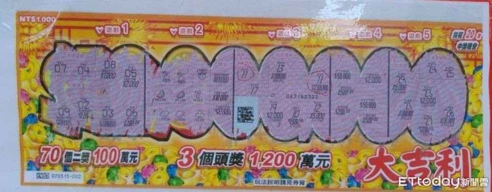 ▲ 台彩「大吉利」刮刮樂,共有3張1200萬元頭獎,日前嘉義縣民雄鄉「加億彩券行」開出一張 。(圖/記者翁伊森翻攝,下同)