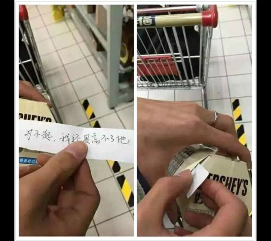 被戲稱為「恐怖攻擊」的紙條總共有5張,包含「對不起,我還是忘不了他」、「我知道妳很愛我,但我更愛她,所以分手吧」等內容,分別被塞到好時巧克力(Hershey's)與另一款Raffaelle餅乾的包裝縫隙裡,接著再放回原位。網友一看全懂了,戒指男的意圖就是要在這個戀人的節日放「炸彈」給剛好挑中的情侶們,這個惡作劇看了令人「心滿意足」。
