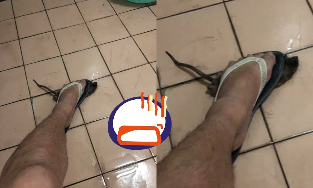 這名男網友在臉書《爆廢公社》貼出照片,文中簡單一句表達當下情況「拉屎拉到一半老鼠跑進來,送死……」仔細看看照片,只見原PO穿著人字夾腳拖,毛茸茸的左腿就踩著一隻毛絨絨的大老鼠,而老鼠的大小看起來竟然跟原PO的半個腳掌差不多大。