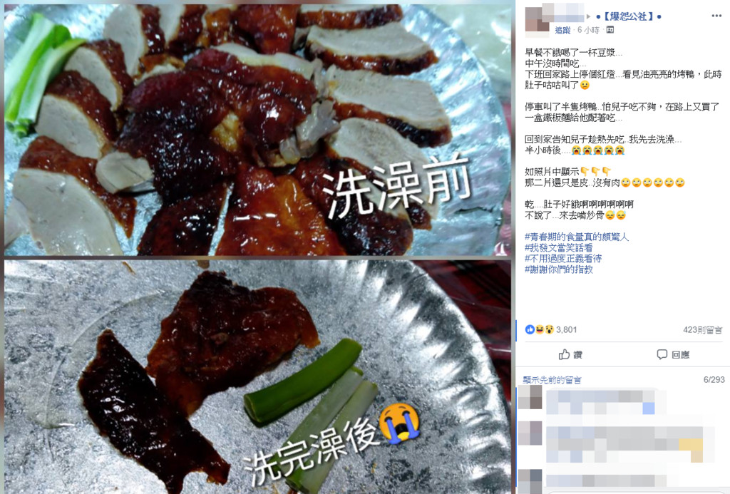該名女網友在臉書社團「爆怨公社」發文表示,她整天吃只喝了一杯豆漿,飢腸轆轆的她看到路邊的烤鴨,便立刻點了半隻烤鴨,還另外買了一盒鐵板麵要給兒子吃。