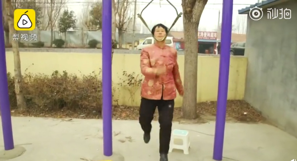 這樣每天到公園「吊單槓」,讓附近的居民都看傻了眼。頭戴軍綠小帽的爺爺說,宋大媽光脖子上勒這個(健身器)往下墜,已經一年多了,且每天都來「健身」。當被詢問「敢不敢嘗試時」,另一位老爺爺火速搖頭,直說這種奇葩健身法太嚇人,「俺不敢」。