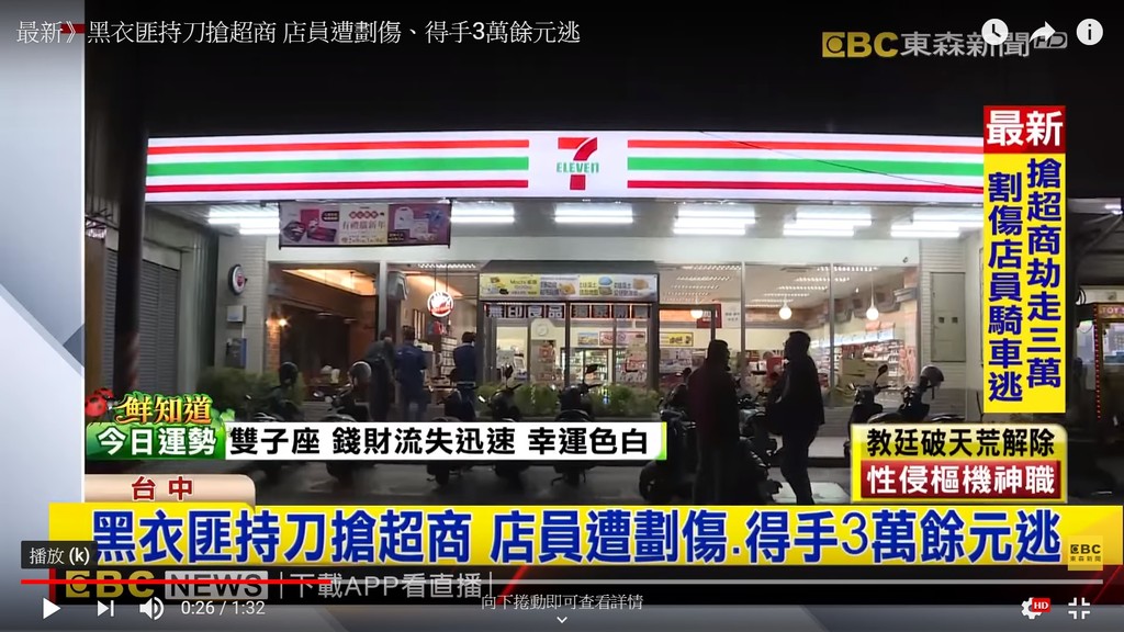 南屯區某超商大夜班黃姓店員,17日第一天在台中上班竟遇上戴安全帽的西瓜刀搶匪,嚇稱「不要動!錢在哪?」,黃男擔心「不配合就死定」,讓他拿走約3萬元,結果在搶匪離開時仍遭劃傷,所幸只有輕傷。警方已鎖定特定對象,全力緝捕。