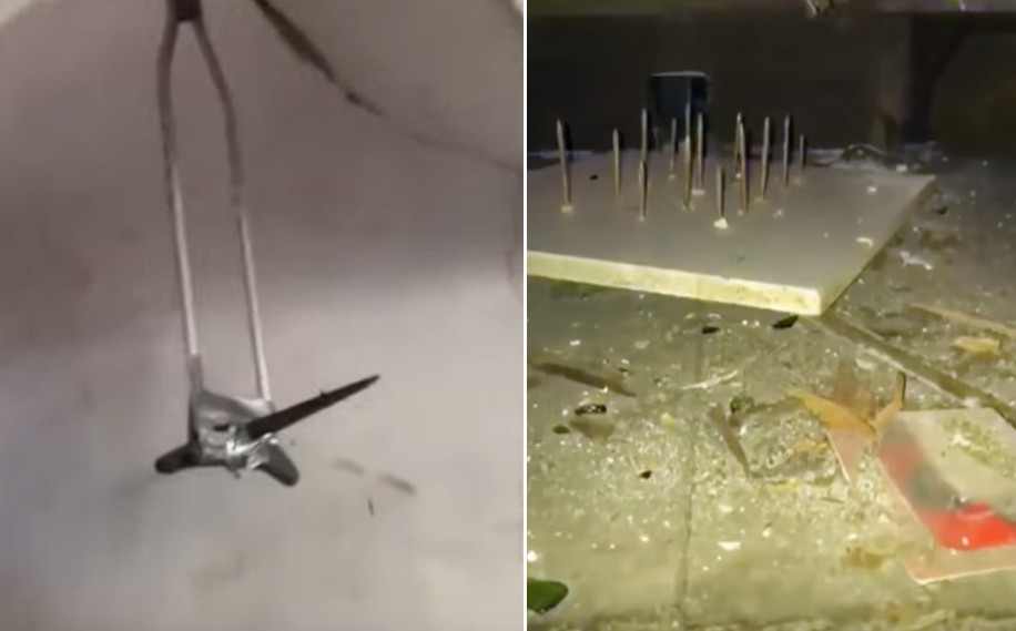從畫面可以看到,男子拿著長竿子在樓梯間來回掃動,下一秒讓所有人驚呆。樓梯上方突然掉下像是拐杖的東西,更恐怖的是,前方用膠帶捆上一根尖尖的鐵柱,其中有一把生鏽且尖銳的尖刀,被綁在2把枴杖上水平擺動著,如果有人不小心觸發了樓梯上的繩子機關,尖刀就會快速掉下,而高度正好處於受害著的臉部,存心要將人臉當場刺穿。