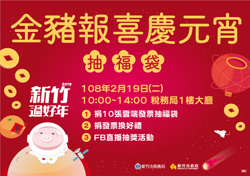 捐發票、抽福袋!2019開春迎好運,新竹市稅務局於2月19日元宵節當日上午10時至下午2時,在1樓大廳舉辦「金豬報喜慶元宵-捐發票抽福袋」活動,只要捐出10張發票,就能抽好運福袋,內容有超值商場提貨券與各式精美禮物,歡迎市民朋友一起來試手氣、做公益、添好運!