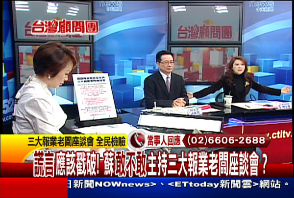 資深評論員周玉蔻直接點出,言論自由是憲法保障的問題,媒體壟斷是市場機制的問題,無論如何「都不需要蘇貞昌介入干預」,反倒是蘇貞昌面對主持三大報業老闆座談會不置可否,「根本就是眼界太短淺」,錯過了一次推動台灣媒體自律考核的機會。周玉蔻建議,「如果蘇貞昌不做,不如請蔡教授(蔡英文)來主持」,拋去亂扣帽子的口水,好好面對中國的市場競爭和經營。