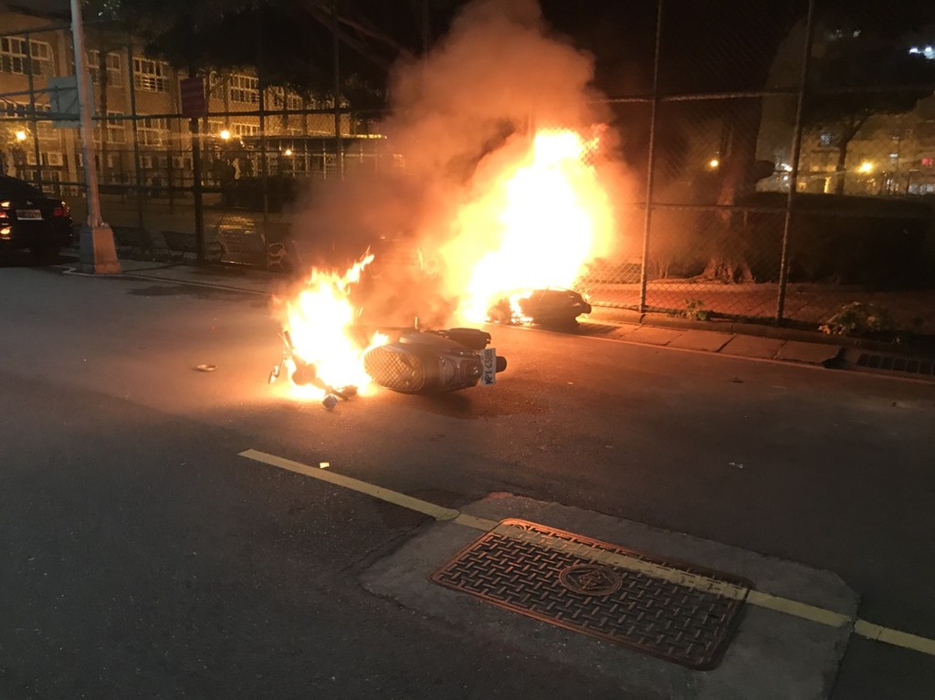 ▲▼少年騎乘的機車,被人持信號彈引燃,燒成兩團火球。(圖/記者趙永博翻攝)