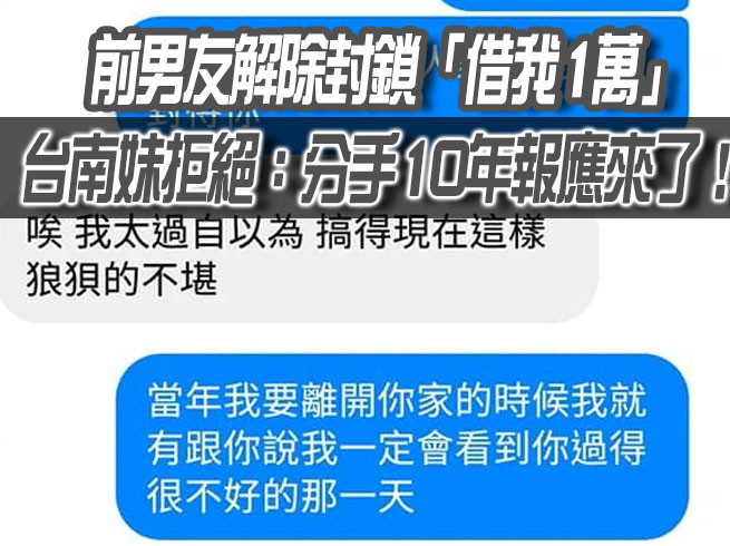 台南一名女網友發文說,「過得很不好的前男友,10年了,報應來了,五告送(台語,指有夠爽)!」原來當事人和前任交往時,還被叫去做八大行業賺錢買車給他,分手後遭對方封鎖,她氣得嗆「我一定會看到你過得很不好的那一天」,如今遇到前任解除封鎖來借1萬元。