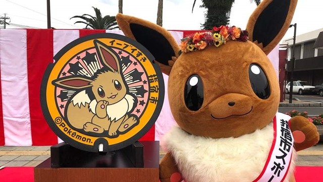 由於指宿市的日文「いぶすき」發音和「喜歡伊布」(イーブイ好き)有點類似,官方便決定請來伊布家族當宣傳大使,目前先在指宿中央的派出所門口設置了特殊的水溝蓋,實在是非常可愛>///<!