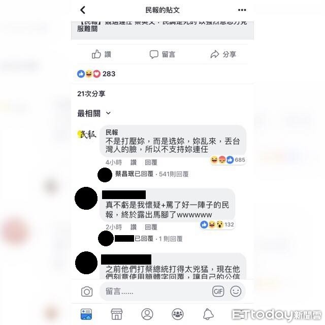 總統蔡英文20日發表迴廊式談話,強調「不接受消滅台灣主權的協議」。媒體《民報》轉貼該臉書直播連結,吸引網友觀看,沒想到小編疑似忘記切換帳號,竟在留言處以簡體字回應,「丟台灣人的臉、不支持妳連任」,引起網友瘋狂討論。