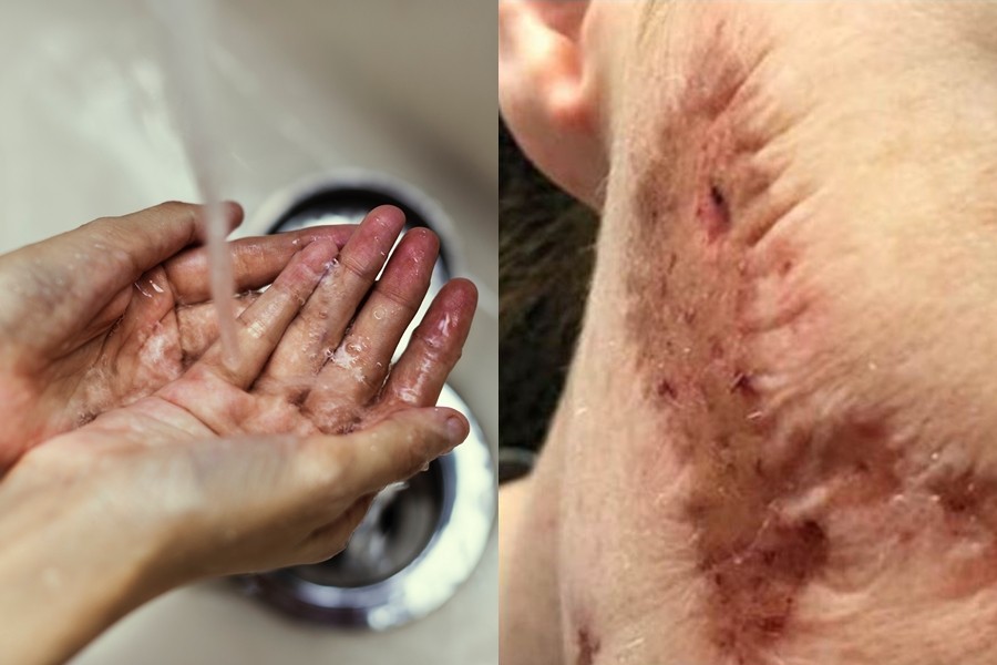 瑞秋分享她在感染KO後臉部受損的照片,顯示這種食肉細菌是如何侵蝕她的臉頰。一開始,瑞秋臉上出現紅色腫塊,看起來像是長了粉刺的皮疹。沒想到狀況隨著時間逐漸惡化,這些紅腫開始變成坑洞,範圍也持續擴大,變得有如殭屍的皮膚一般。