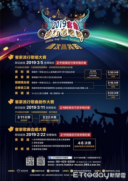 桃園市「客家流行音樂節」活動,近年來,已成為國內客家界年度指標性音樂盛事,今年總獎金178萬,為吸引更多客家唱將參加,客家局21日指出,「2019客家流行音樂節」的「客家流行歌唱大賽」及「客家流行歌曲創作大賽」報名截止日,分別延長至3月5日及3月11日,籲民眾踴躍報名!