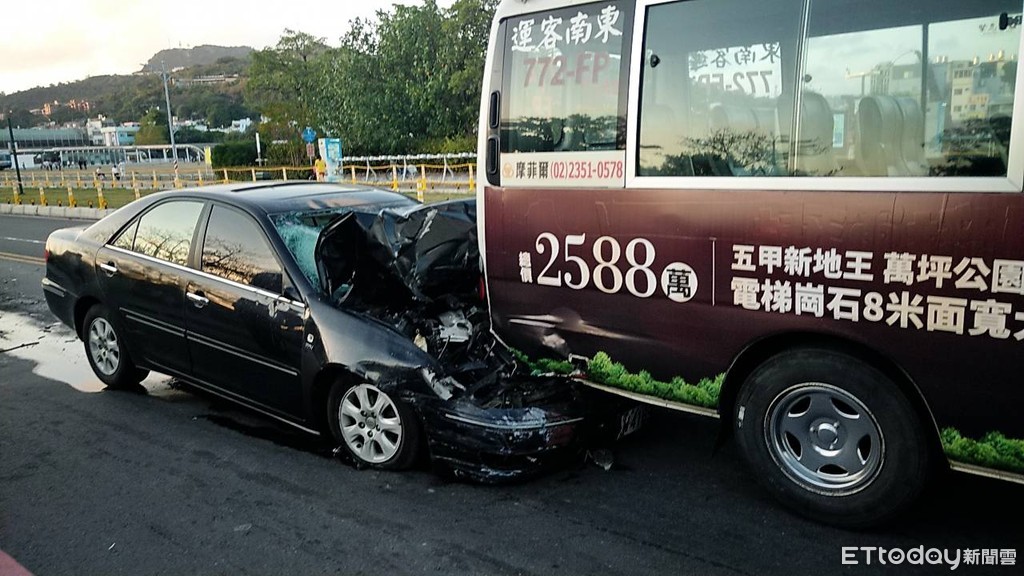 ▲吳姓女子所駕駛的黑色轎車,不知何故撞上前方公車後釀成連環車禍。(圖/記者洪正達翻攝,下同)