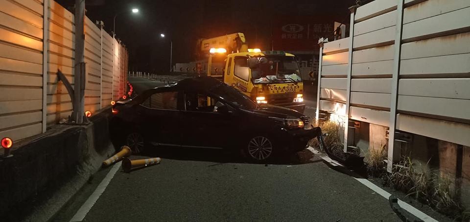 黑色轎車幾乎全毀整台橫擋在準備下閘道的入口處,也引逃不過網友們的毒舌,「這側的相機不會拍」、「飄移失敗 趕快按重置啊」、「一定是在玩猜猜看哪一邊」。