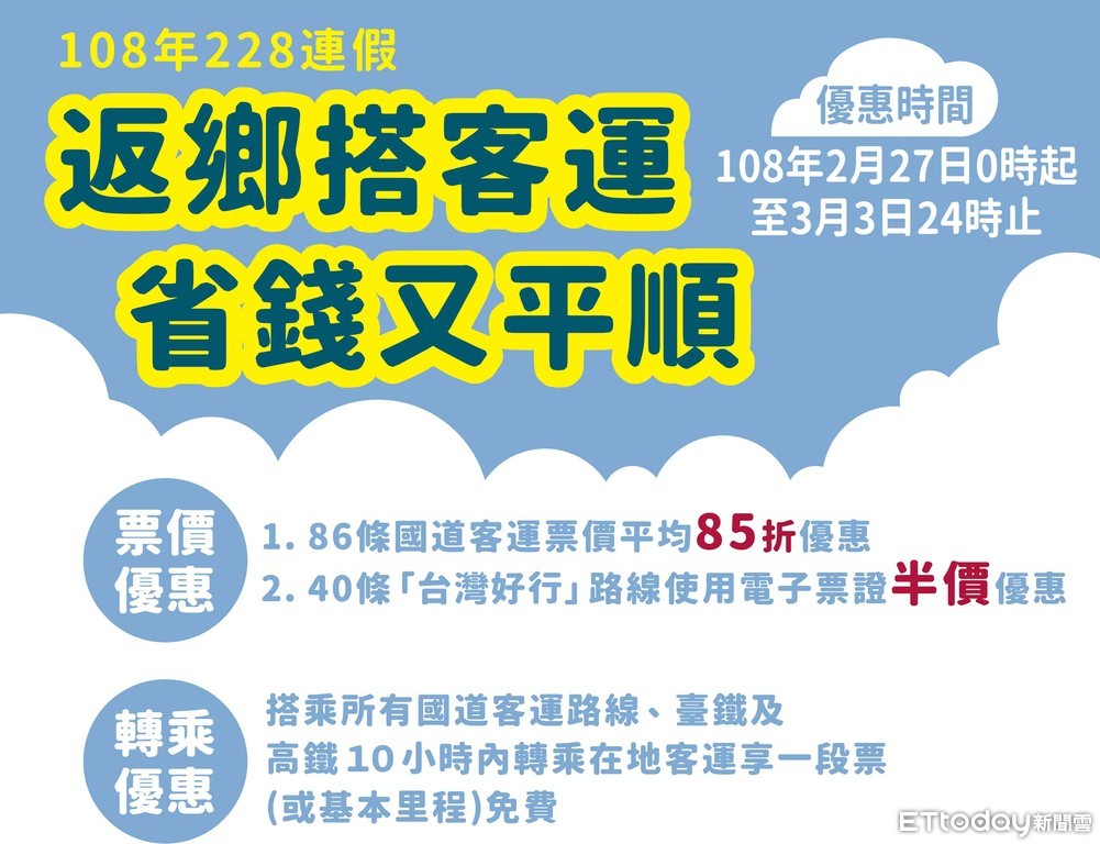 為紓解國道交通壅塞,鼓勵大眾多加使用各項公共運輸作為返鄉或觀光的交通工具,108年228連續假期將持續辦理「國道客運票價優惠及公共輸轉乘措施」,預計實施期間為108年2月27日0時起至108年3月3日24時止,優惠內容如下:一、40條「台灣好行」路線使用電子票證半價優惠。二、14家86條國道客運路線平均85折票價優惠。三、凡使用電子票證搭乘國道客運、臺鐵及高鐵搭乘國道客運路線後,於10小時內轉乘在地市區或公路客運享1段票(或基本里程)免費;另如持紙票搭乘者,可於各場站使用電子票證於場站過卡機進行過卡,後續再使用電子票證轉乘亦可享有優惠。(每日轉乘優惠次數不限,惟每次優惠須搭配搭乘1趟國道客運路線。)