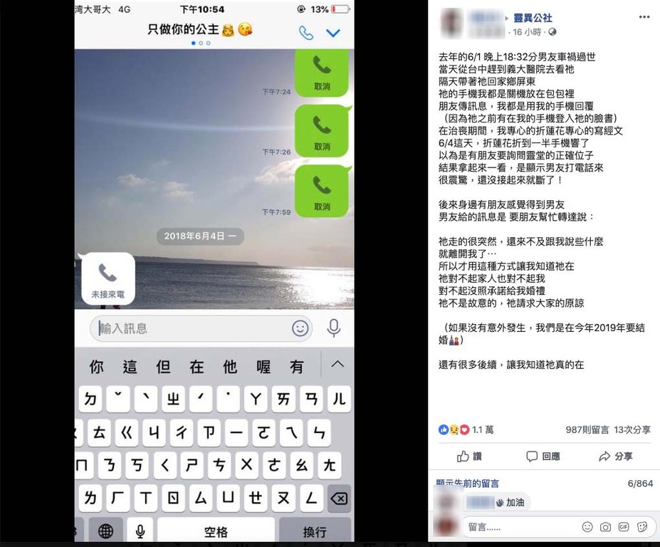 一位女網友在2018年6月1日時男友因車禍過世,發文透露男友為了讓她知道「祂還在」,用LINE打電話,結果透過能感應的朋友轉達,男友因為無法實現結婚的承諾,希望請求原諒,讓上萬網友不捨流淚,紛紛按讚打氣。