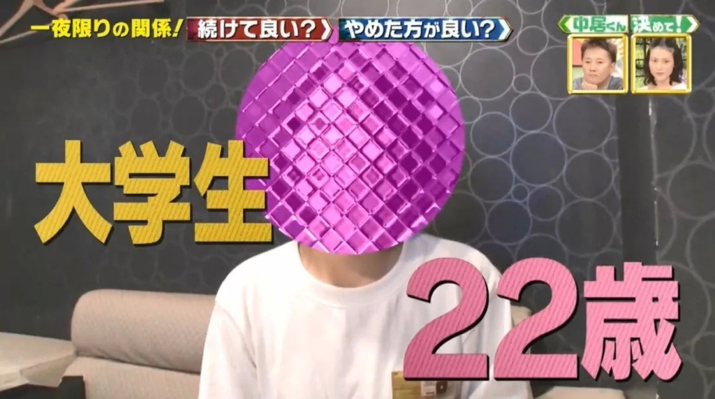 日本一個節目「中居くん决めて!」,主旨是要幫助有煩惱的人解決問題,並給出一些建議。這次節目組就找到了一名22歲的女大生,這位女大生和一般大學生一樣,只不過她有個不為人知的小秘密:她對「一夜情」這件事非常上癮。