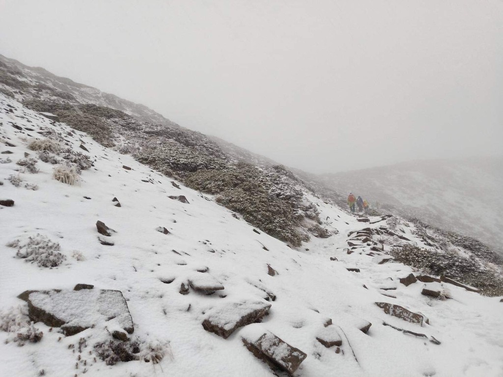 【16:20】更新:氣象局表示,玉山12時10分到13時40分,一度出現降雨夾雪狀況,雨量2.5 mm、積雪0公分。現在玉山沒有降雪也沒有下雨,能見度100公尺。