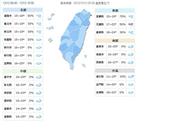 另外,中央氣象局提醒,12日台灣北部及東半部地區有局部短暫雨,其他地區及澎湖、金門、馬祖為多雲到晴。13日起氣溫回升;台灣各地區及澎湖、金門、馬祖大多為多雲到晴的天氣,僅東半部地區有局部短暫雨。