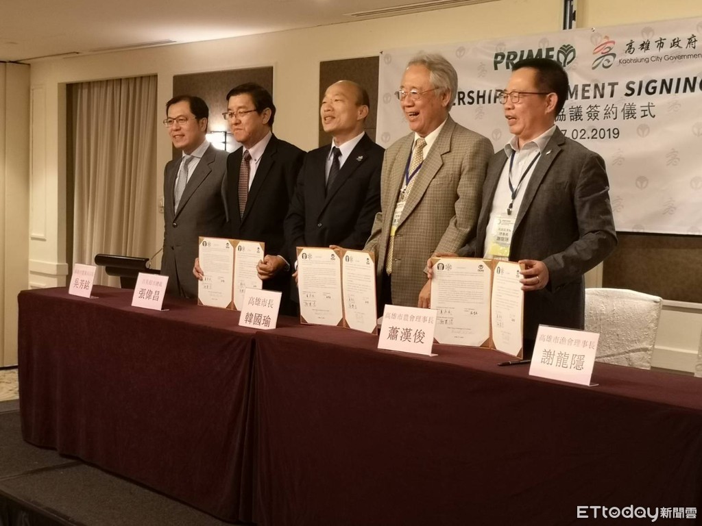 ▲在怒嗆陳吉仲後,韓國瑜晚間又與百美超市總裁(左二)談下3年共3400萬台幣的農漁產訂單。(圖/記者洪正達攝)