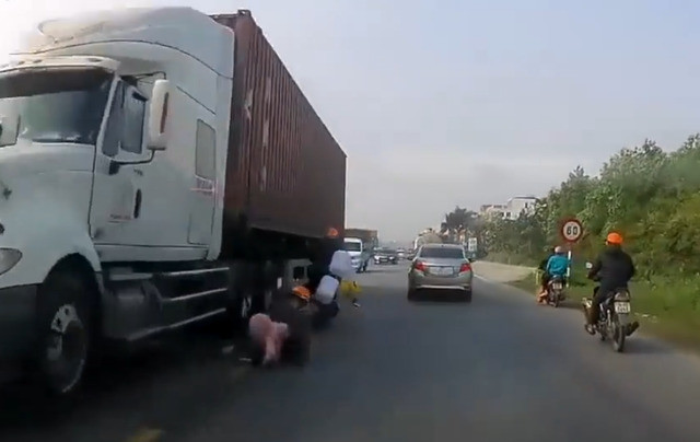 真是太驚險了!一輛三貼機車遭擦撞,導致坐後面的母女摔落,此時對向車道正好一輛大貨車疾駛而來,就在千鈞一髮之際,這位媽媽一把將女兒拉住,不但救了女兒也救了自己。