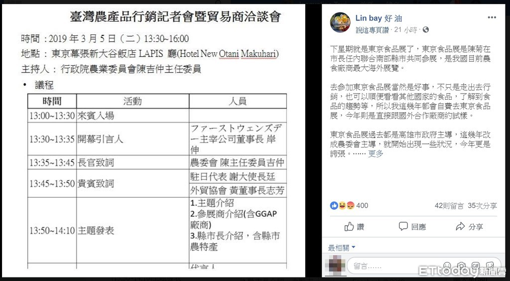 「Lin bay 好油」指出提到,東京食品展是我國目前最大的農食廠商海外展覽台灣,去參加是好事,不只是走出去行銷,也可以順便看看其他國家的食品,了解到食品的趨勢等,而過去幾年東京食品展都是由高雄市政府主導,但這幾年改成農委會主導,就開始出現一些狀況,今年更是誇張。
